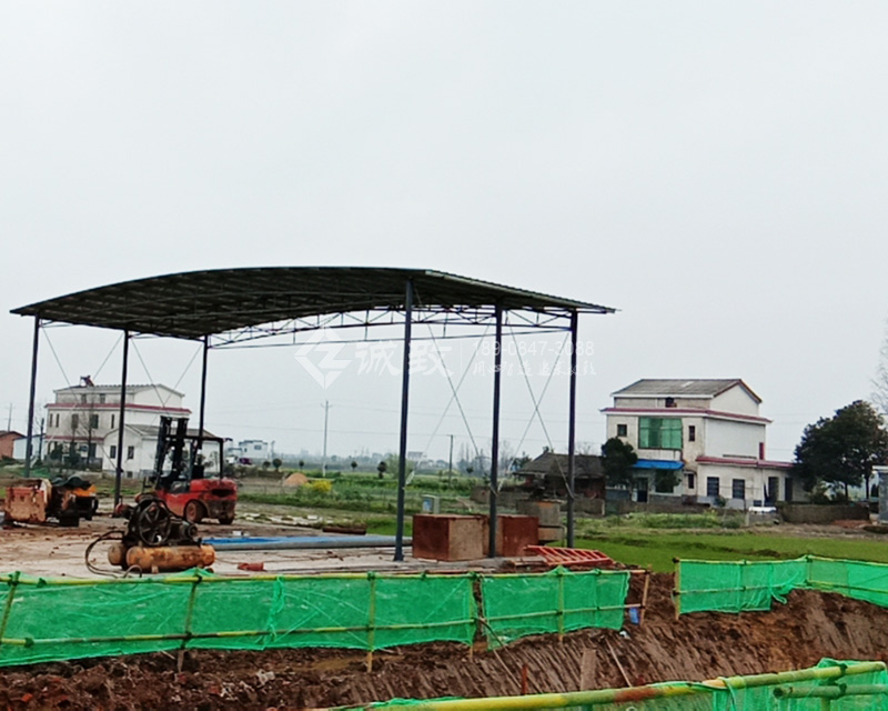 來,看看遠(yuǎn)方,那個(gè)就是固定鋼筋遮雨棚,主體采用D110圓管作為承重立柱、弧形梁采用D48圓管,再固定上40*80的方管做分重檁條,然后采用藍(lán)色的單瓦覆蓋在頂面,就這樣組成了簡(jiǎn)易的鋼筋棚,起到遮陽(yáng)擋雨的作用。
