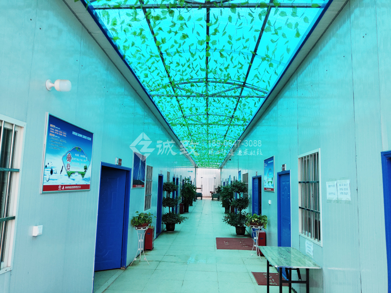 你看,中間的過道采用了淡藍(lán)色的陽光棚鑲嵌上自然綠葉的點(diǎn)綴,連空氣都清新得像被大自然洗過一般。
