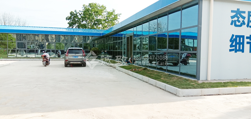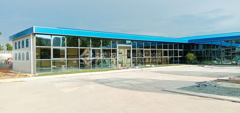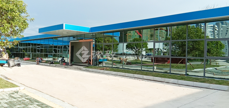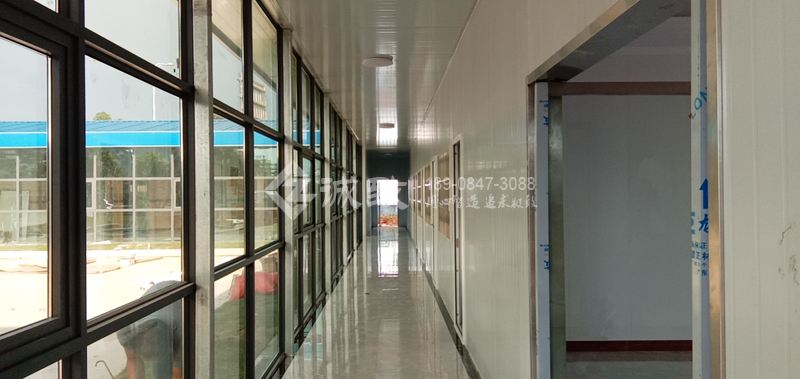 走道前墻配置的是玻璃幕墻,是比較高檔的活動板房。玻璃幕墻采用了由鏡面玻璃與普通玻璃組合,隔層充入干燥空氣或惰性氣體的中空玻璃。