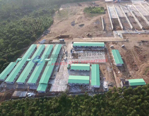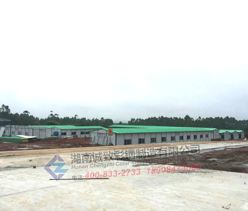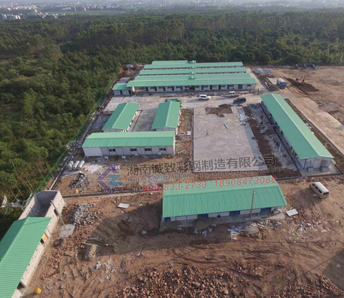 工程介紹: 本項目部駐地工程建有3000平方的標準K式豆綠色活動板房,配備辦公室、試驗室、會議室、宿舍、廚房、大小餐廳、男女浴室與廁所,娛樂室,機修倉庫,籃球場等,功能齊全,全方位打造一個溫馨、高效、美觀的項目部駐地,我們湖南誠致彩鋼贏得了客戶的一致好評。